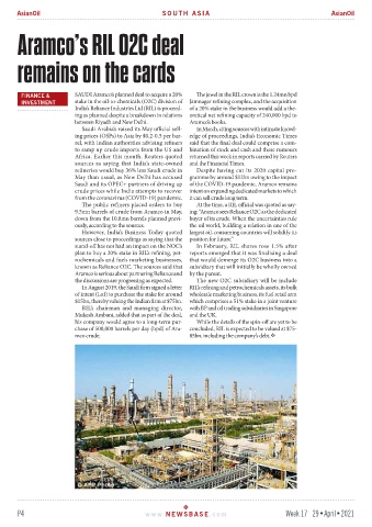 FINANCE & SAUDI Aramco’s planned deal to acquire a 20% The jewel in the RIL crown is the 1.24mn bpd