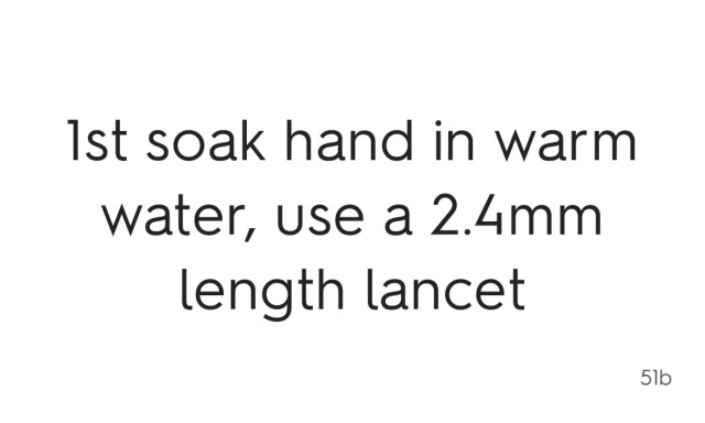 1st soak hand in warm water, use a 2.4mm length lancet 51b