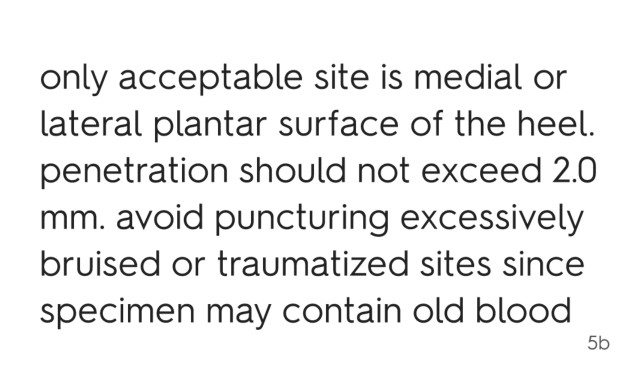 only acceptable site is medial or lateral plantar surface of the heel. penetration should not exceed 2.0 mm. avoid puncturing excessively bruised or traumatized sites since specimen may contain old blood 5b