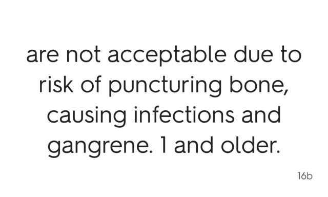 are not acceptable due to risk of puncturing bone, causing infections and gangrene. 1 and older. 16b