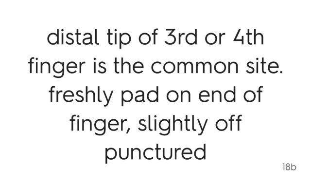 distal tip of 3rd or 4th finger is the common site. freshly pad on end of finger, slightly off punctured 18b