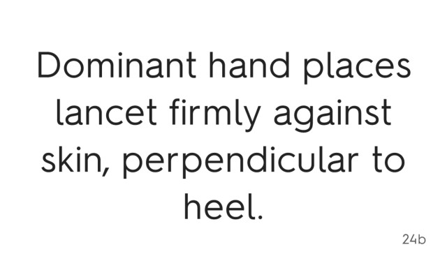 Dominant hand places lancet firmly against skin, perpendicular to heel. 24b