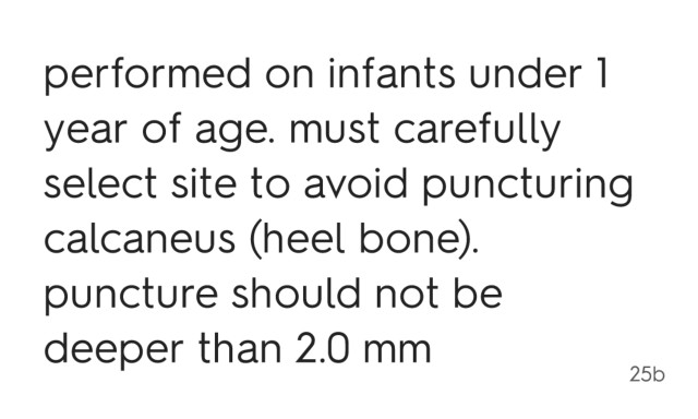 performed on infants under 1 year of age. must carefully select site to avoid puncturing calcaneus (heel bone). puncture should not be deeper than 2.0 mm 25b