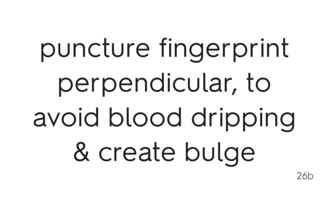 puncture fingerprint perpendicular, to avoid blood dripping & create bulge 26b
