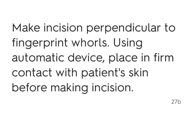 Make incision perpendicular to fingerprint whorls. Using automatic device, place in firm contact with patient's skin before making incision. 27b