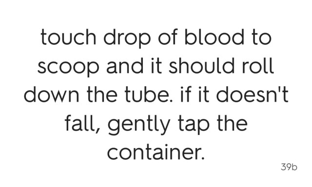 touch drop of blood to scoop and it should roll down the tube. if it doesn't fall, gently tap the container. 39b