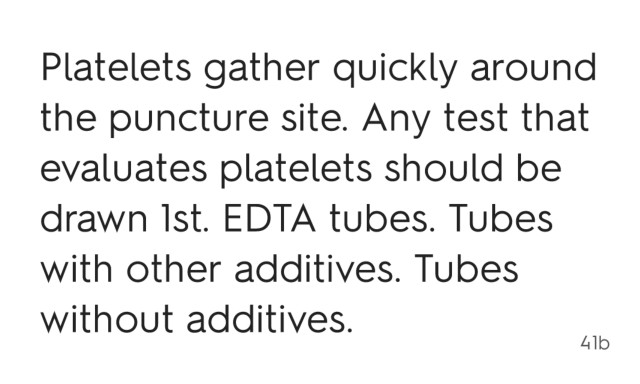 Platelets gather quickly around the puncture site. Any test that evaluates platelets should be drawn 1st. EDTA tubes. Tubes with other additives. Tubes without additives. 41b