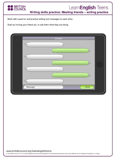 Writing skills practice: Meeting friends – writing practice Work with a partner and practise writing text messages to each other. Start by inviting your friend out, or ask them what they are doing.