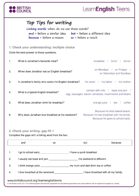 5.     What does Jonathan drink for breakfast?                          orange juice    /    tea    /    coffee