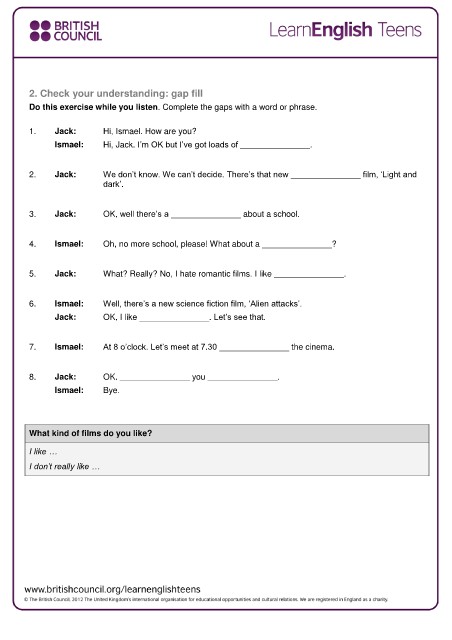 5. Jack: What? Really? No, I hate romantic films. I like _______________.