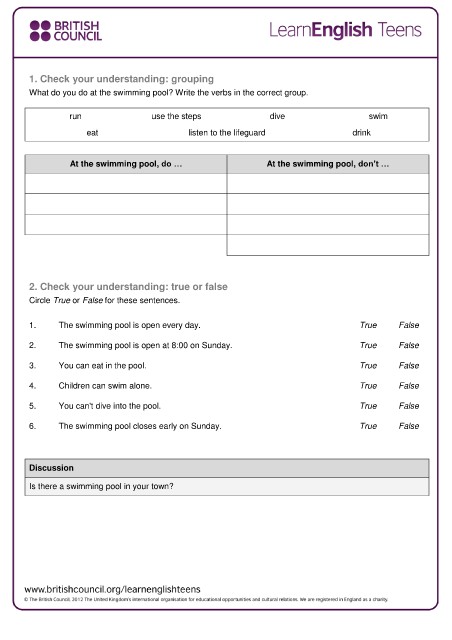 What do you do at the swimming pool? Write the verbs in the correct group.