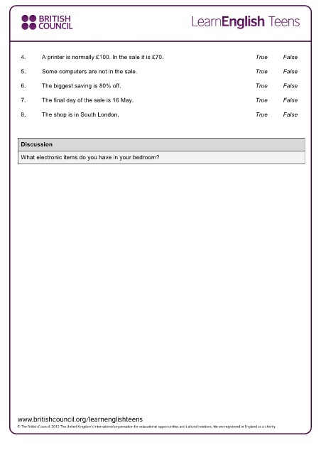 4. A printer is normally £100. In the sale it is £70. True False