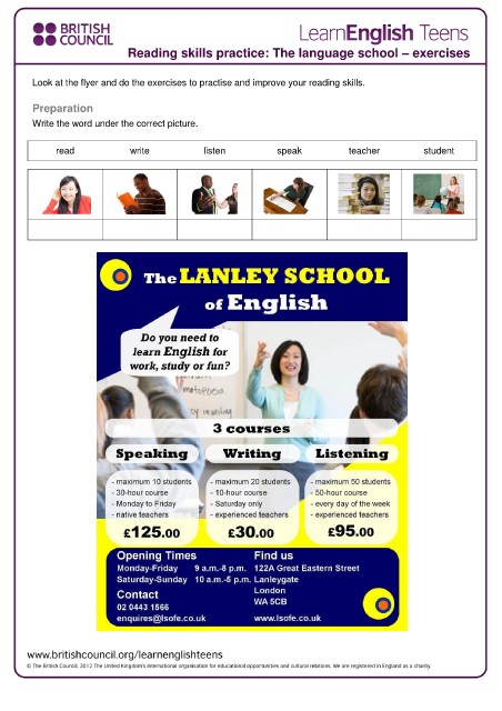 Reading skills practice: The language school – exercises Look at the flyer and do the exercises to practise and improve your reading skills. Preparation Write the word under the correct picture. read write listen speak teacher student