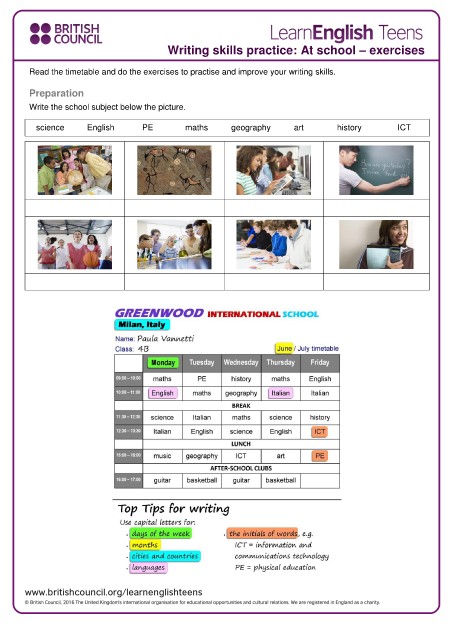 Writing skills practice: At school – exercises Read the timetable and do the exercises to practise and improve your writing skills. Preparation Write the school subject below the picture. science English PE maths geography art history ICT