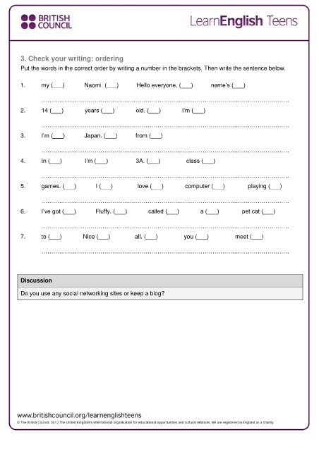 Put the words in the correct order by writing a number in the brackets. Then write the sentence below.