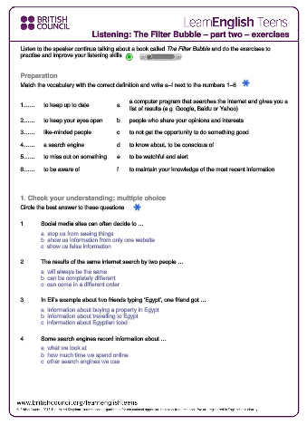 Listen to the speaker continue talking about a book called The Filter Bubble and do the exercises to