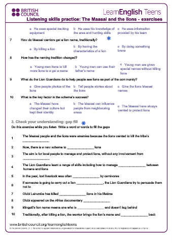 a. Give people photos of the b. Tell people stories about c. Give the lions Maasai