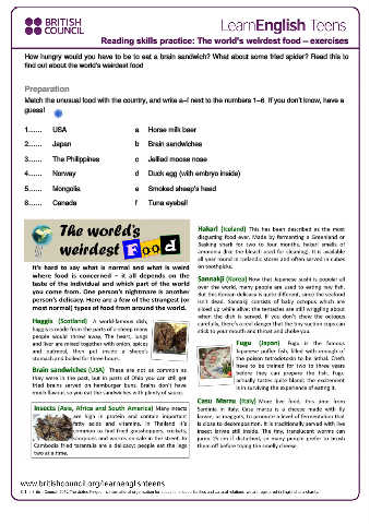 Match the unusual food with the country, and write a–f next to the numbers 1–6. If you don’t know, have a