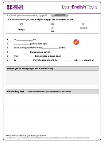 6. Go _______________ the traffic lights and take the _______________ right on to King’s Road.
