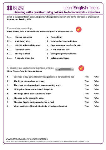 Listen to the presentation about using colours to organise homework and do the exercises to practise and