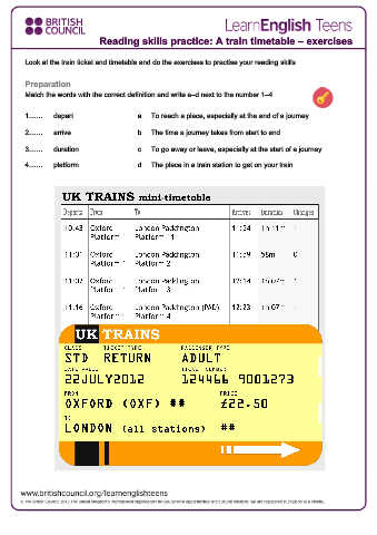 Look at the train ticket and timetable and do the exercises to practise your reading skills.