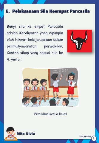 E. Pelaksanaan Sila Keempat Pancasila Bunyi sila ke empat Pancasila adalah Kerakyatan yang dipimpin oleh hikmat kebijaksanaan dalam permusyawaratan perwakilan. Contoh sikap yang sesuai sila ke 4, yaitu : Pemilihan ketua kelas Mita Ulvia halaman 9