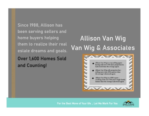 Since 1988, Allison has been serving sellers and home buyers helping Allison Van Wig them to realize their real estate dreams and goals. Van Wig & Associates Over 1,600 Homes Sold and Counting! For the Best Move of Your life … Let Me Work For You
