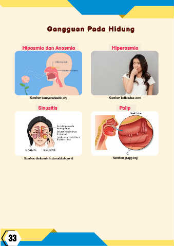 G a n g g u a n P a d a H i d u n g G a n g g u a n P a d a H i d u n g Hiposmia dan Anosmia Hiperosmia Sumber: narayanahealth.org Sumber: hellosehat.com Sinusitis Polip Sumber: dinkominfo.demakkab.go.id Sumber: gaapp.org 33