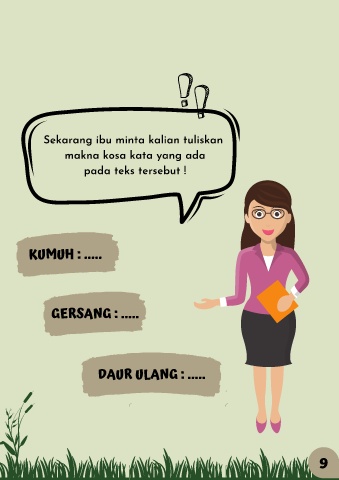 Sekarang ibu minta kalian tuliskan makna kosa kata yang ada pada teks tersebut ! KUMUH : ..... GERSANG : ..... DAUR ULANG : ..... 9