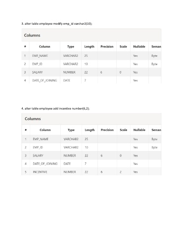 3. alter table employee modify emp_id varchar2(10); 4. alter table employee add incentive number(6,2);
