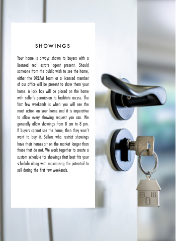 Your home is always shown to buyers with a licensed real estate agent present. Should someone from the public wish to see the home, either the DREAM Team or a licensed member of our office will be present to show them your home. A lock box will be placed on the home with seller’s permission to facilitate access. The first few weekends is when you will see the most action on your home and it is imperative to allow every showing request you can. We generally allow showings from 8 am to 8 pm. If buyers cannot see the home, then they won’t want to buy it. Sellers who restrict showings have their homes sit on the market longer than those that do not. We work together to create a custom schedule for showings that best fits your schedule along with maximizing the potential to sell during the first few weekends.