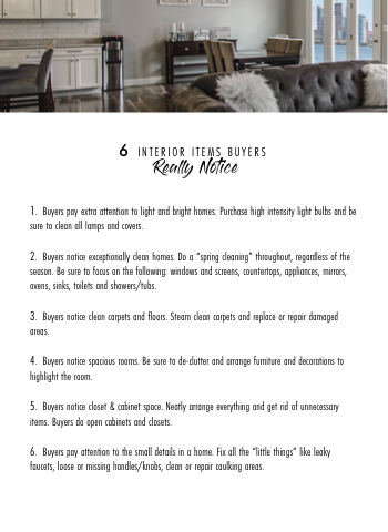 2. Buyers notice exceptionally clean homes. Do a “spring cleaning” throughout, regardless of the season. Be sure to focus on the following: windows and screens, countertops, appliances, mirrors, ovens, sinks, toilets and showers/tubs.