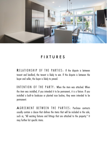 INTENTION OF THE PARTY: When the item was attached. When the item was installed, if you intended it to be permanent, it is a fixture. If you installed a built-in bookcase or planted rose bushes, they were intended to be permanent.