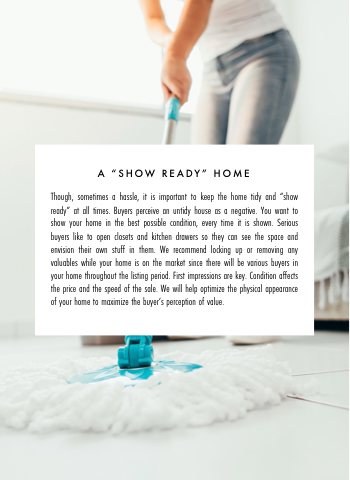 Though, sometimes a hassle, it is important to keep the home tidy and “show ready” at all times. Buyers perceive an untidy house as a negative. You want to show your home in the best possible condition, every time it is shown. Serious buyers like to open closets and kitchen drawers so they can see the space and envision their own stuff in them. We recommend locking up or removing any valuables while your home is on the market since there will be various buyers in your home throughout the listing period. First impressions are key. Condition affects the price and the speed of the sale. We will help optimize the physical appearance of your home to maximize the buyer’s perception of value.