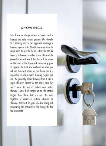 Your home is always shown to buyers with a licensed real estate agent present. We subscribe to a showing service that approves showings to licensed agents only. Should someone from the public wish to see the home, either the DREAM Team or a licensed member of our office will be present to show them. A lock box will be placed on the front of the home with access only given to agents. The first few weekends is when you will see the most action on your home and it is imperative to allow every showing request you can. We generally allow showings from 8 am to 8 pm. If buyers cannot see the home, then they won’t want to buy it. Sellers who restrict showings have their homes sit on the market longer than those that do not. We work together to create a custom schedule for showings that best fits your schedule along with maximizing the potential to sell during the first few weekends.