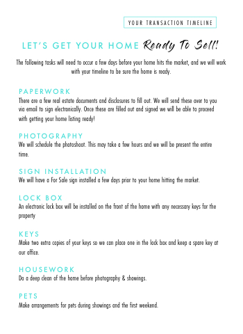 LET’S GET YOUR HOME Ready To Sell! The following tasks will need to occur a few days before your home hits the market, and we will work