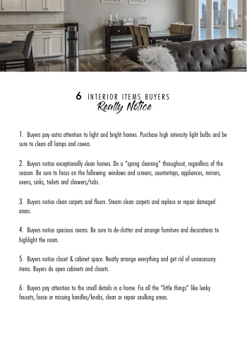 2. Buyers notice exceptionally clean homes. Do a “spring cleaning” throughout, regardless of the season. Be sure to focus on the following: windows and screens, countertops, appliances, mirrors, ovens, sinks, toilets and showers/tubs.