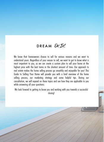 We know that homeowners choose to sell for various reasons and we want to understand yours. Regardless of your reason to sell, we want to get to know what is most important to you, so we can create a custom plan to sell your home at the highest price with the best terms in the shortest amount of time. Our approach to real estate makes the home selling process go smoothly and enjoyable for you! This Guide to Selling Your Home will provide you with a brief overview of the home selling process, our marketing strategy and some helpful tips. During our consultation, we will expand on these topics and see how they are applicable to you while answering all your questions.