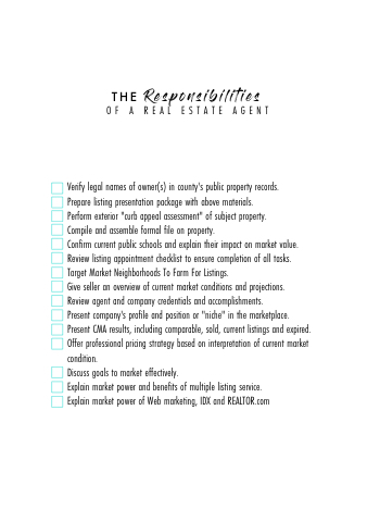 Confirm current public schools and explain their impact on market value. Review listing appointment checklist to ensure completion of all tasks. Target Market Neighborhoods To Farm For Listings.