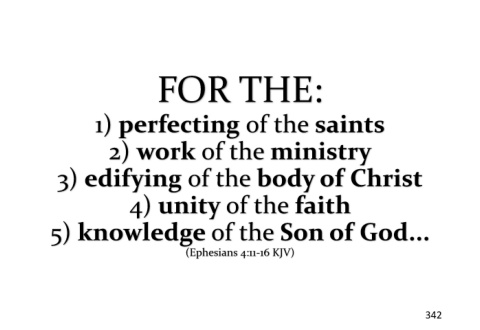 FOR THE: 1) perfecting of the saints 2) work of the ministry 3) edifying of the body of Christ 4) unity of the faith 5) knowledge of the Son of God... (Ephesians 4:11-16 KJV) 342