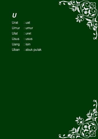 U Urat : uat Umur : umur Ulat : uret Usus : usus Uang : isin Uban : abuk pulak