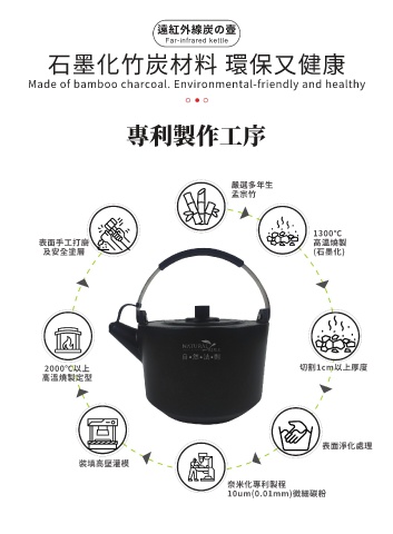 遠紅外線炭の壺 Far-infrared kettle 石墨化竹炭材料 環保又健康 Made of bamboo charcoal. Environmental-friendly and healthy 專利製作工序 嚴選多年生 孟宗竹 1300℃ 表面手工打磨 高溫燒製 及安全塗層 (石墨化) 2000℃以上 切割1cm以上厚度 高溫燒製定型 表面淨化處理 裝填高壓灌模 奈米化專利製程 10um(0.01mm)微細碳粉