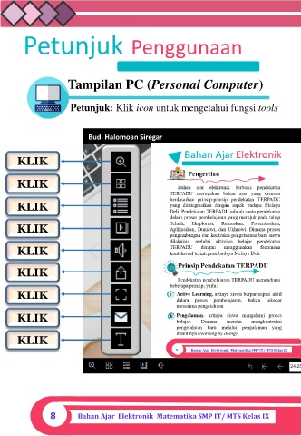 Petunjuk Penggunaan Tampilan PC (Personal Computer) Petunjuk: Klik icon untuk mengetahui fungsi tools Budi Halomoan Siregar KLIK KLIK KLIK KLIK KLIK KLIK KLIK KLIK KLIK 8 Bahan Ajar Elektronik Matematika SMP IT/ MTS Kelas IX