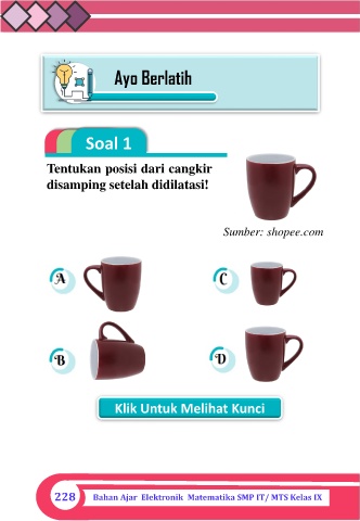 Ayo Berlatih Soal 1 Tentukan posisi dari cangkir disamping setelah didilatasi! Sumber: shopee.com a c b d Klik Untuk Melihat Kunci 228 Bahan Ajar Elektronik Matematika SMP IT/ MTS Kelas IX