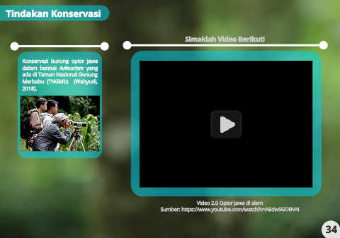 Tindakan Konservasi Simaklah Video Berikut! Konservasi burung opior jawa dalam bentuk Avitourism yang ada di Taman Nasional Gunung Merbabu (TNGMb) (Wahyudi, 2018). Video 2.0 Opior jawa di alam Sumber: https://www.youtube.com/watch?v=A6dwSGOBV4I 34
