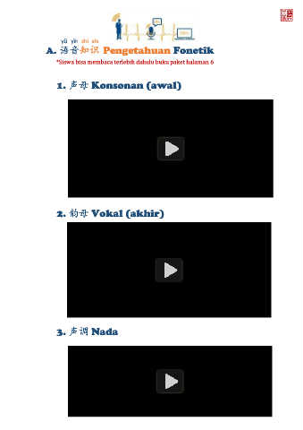 yǔ yīn zhī shi A. 语音知识 Pengetahuan Fonetik *Siswa bisa membaca terlebih dahulu buku paket halaman 6 1. 声母 Konsonan (awal) 2. 韵母 Vokal (akhir) 3. 声调 Nada