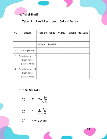 a. Tabel Hasil Tabel 2.1 Hasil Percobaan Osilasi Pegas Analisis Data 1. 2. √ b. Analisis Data 1) √ 2) √ 3) 41