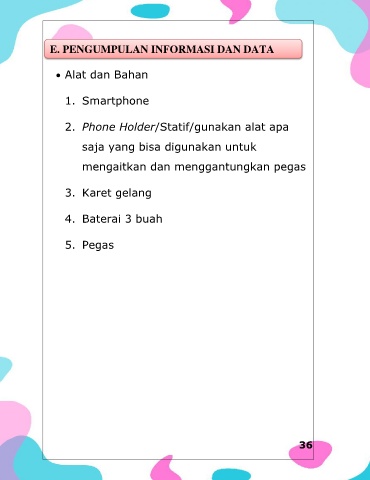 E. PENGUMPULAN INFORMASI DAN DATA Alat dan Bahan 1. Smartphone 2. Phone Holder/Statif/gunakan alat apa saja yang bisa digunakan untuk mengaitkan dan menggantungkan pegas 3. Karet gelang 4. Baterai 3 buah 5. Pegas 36