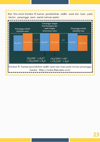 Mari kita amati Gambar 13 ilustrasi penambahan sedikit asam dan basa pada larutan penyangga asam asetat-natrium asetat. Gambar 13. Ilustrasi penambahan sedikit asam dan basa pada larutan penyangga Sumber : https://online.flipbuilder.com/ 23