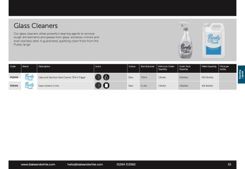 Our glass cleaners utilise powerful cleaning agents to remove tough dirt elements and grease from glass, windows, mirrors and even stainless steel. A guaranteed, sparkling clean finish from the Purely range.